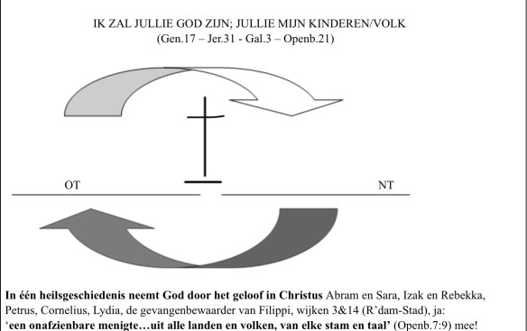 - Eén belofte/één Verbond: twee ‘bedelingen’. Het verbond met Abraham blijft staan! De kernbelofte van God is: ‘Ik zal jullie God zijn; jullie mijn kinderen/volk.’ Die belofte vind je overal terug. Een paar belangrijke momenten: Genesis 17:7, Jeremia 31:33 en 36, Ezechiël 36:28, Galaten 3:26, Openbaring 21:3 (zie afb.1).