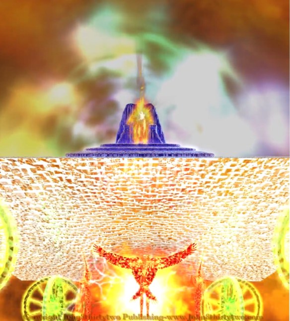 Er zijn heel wat pogingen gedaan om vast te leggen wat Ezechiël zag. Ik vond een animatie op YouTube, afkomstig van de site www.John8thirtytwo.com. De cherubs, wielen, het ijskristal. En ook de troon en degene die daarop zit: