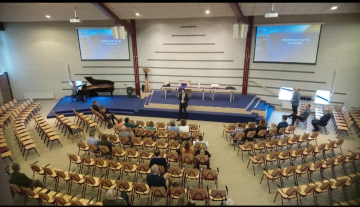 Eredienst in tijd van Corona. Toen er nog 100 mensen samen mochten komen, waren we met ongeveer 30 mensen. Nu zijn alleen diegenen aanwezig die nodig zijn voor het maken van een online-dienst (Kandelaarkerk te Dordrecht).