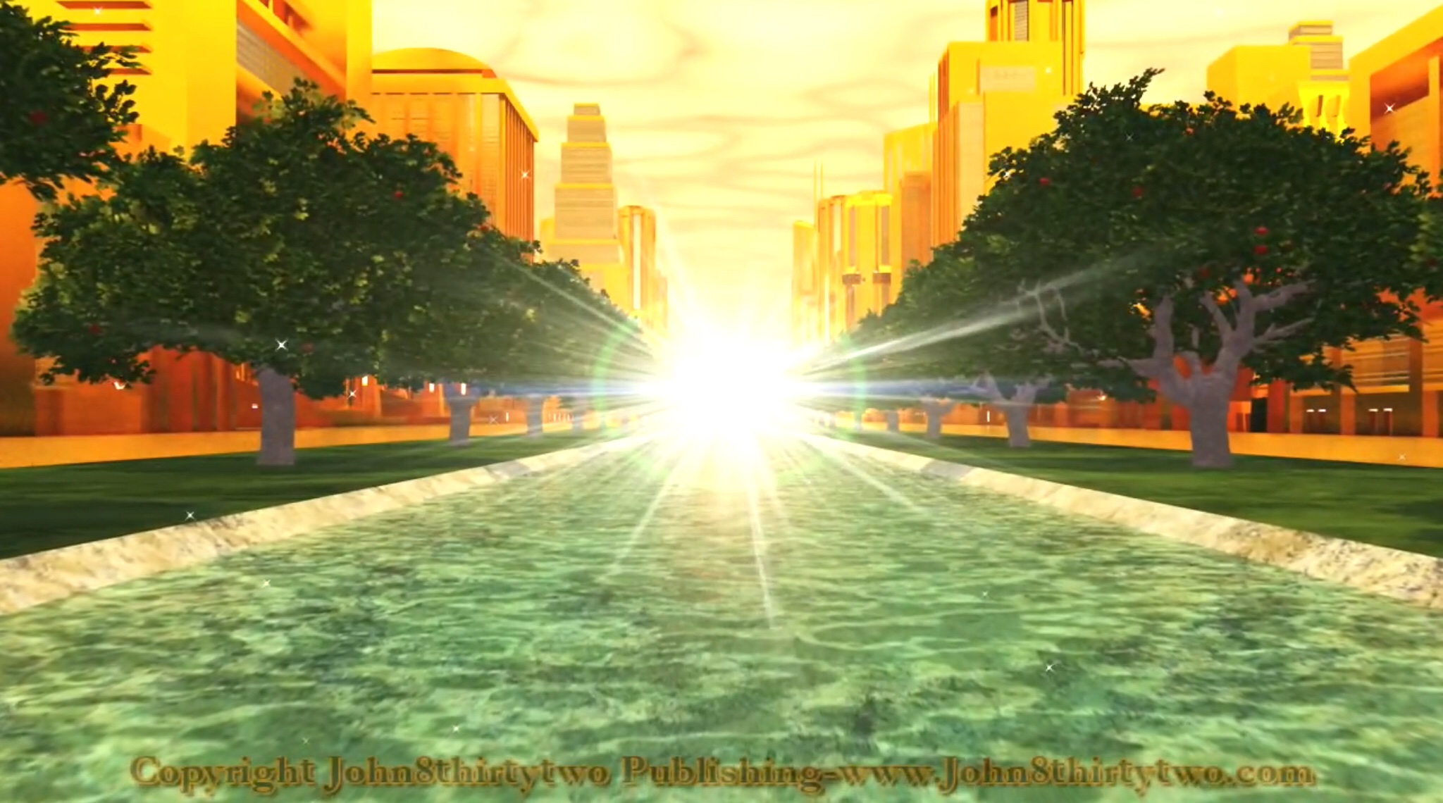 De engel liet me ook een rivier zien met water dat eeuwig leven geeft. Het water was zo helder als kristal. Het stroomde uit de troon van God en van het lam, dwars door de stad. Aan beide kanten van de rivier stond een boom die eeuwig leven geeft.