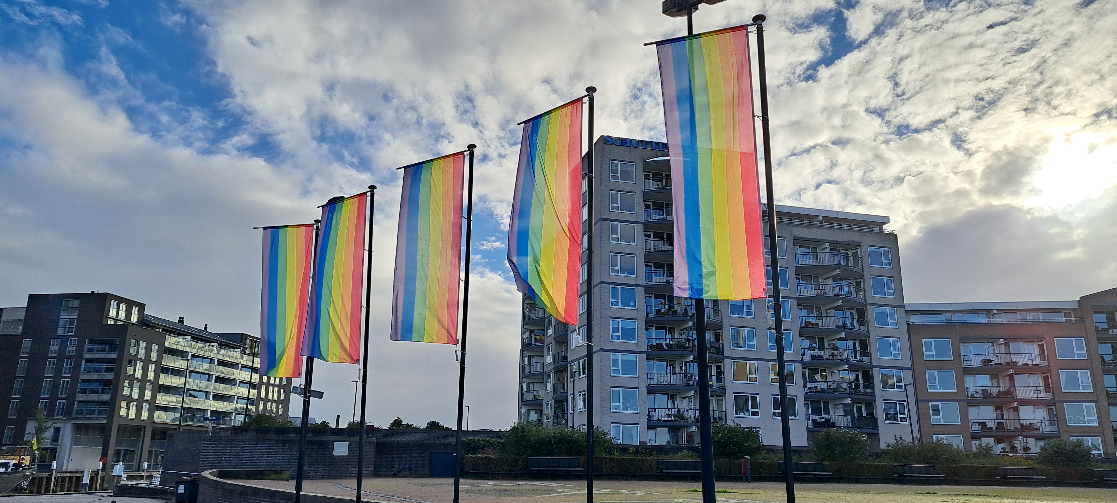 20221010_165405 Published november 5, 2022 at 4624 × 2084 in Hoe ik tot een ander inzicht over homoseksuele relaties kwam. Artikel in het Nederlands Dagblad De Bijbel relativeert in zijn tijd het man- of vrouwzijn. Dat werpt licht op onze tijd. In Jezus doet het er niet toe of je hetero of homo bent (foto: regenboogvlaggen te Dordrecht, (foto jmh)).